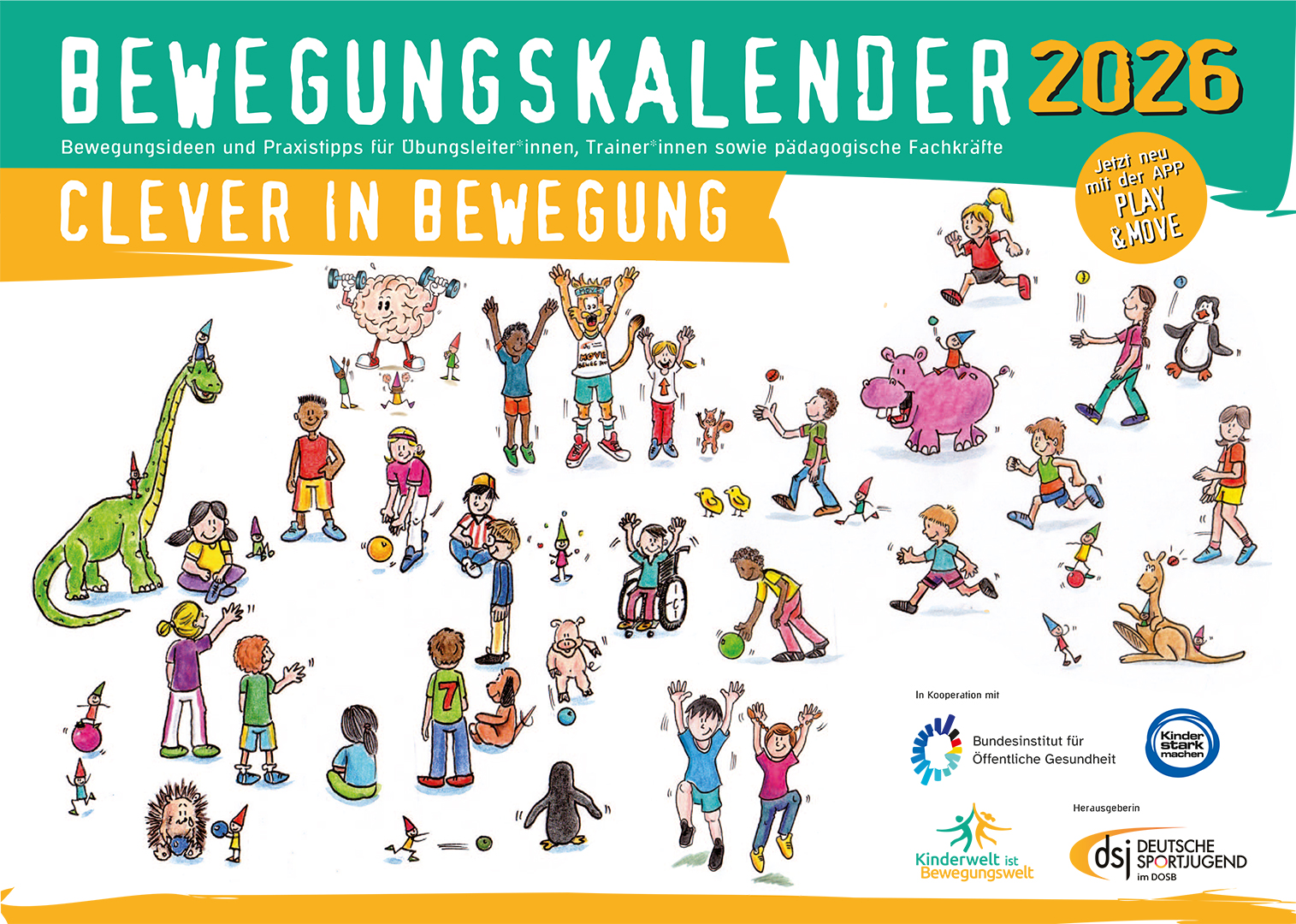 Der neue Bewegungskalender für das Jahr 2026 der Deutschen Sportjugend (dsj) unterstützt Trainer*innen, Übungsleiter*innen und pädagogische Fachkräfte dabei, die exekutiven Funktionen und die Selbstregulation von Kindern systematisch zu fördern. Mit insgesamt 15 abwechslungsreichen Spielideen werden zentrale Gehirnfunktionen fortlaufend aktiviert und trainiert. Unterschiedliche Schwierigkeitsstufen sorgen dafür, dass die Anforderungen behutsam gesteigert werden können – für eine nachhaltige kognitive Entwicklung über längere Zeit hinweg. 🏓⚽️🛹🎽🛝🥅🪀