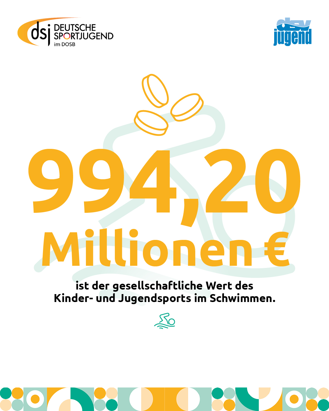 994,20 Millionen Euro! Das ist der gesellschaftliche Wert des Kinder- und Jugendsports im Schwimmen pro Jahr! Die Analyse zum Social Return on Investment (SROI) der @deutschesportjugend zeigt ganz klar: Kinder- und Jugendsport ist mehr als Bewegung ❗