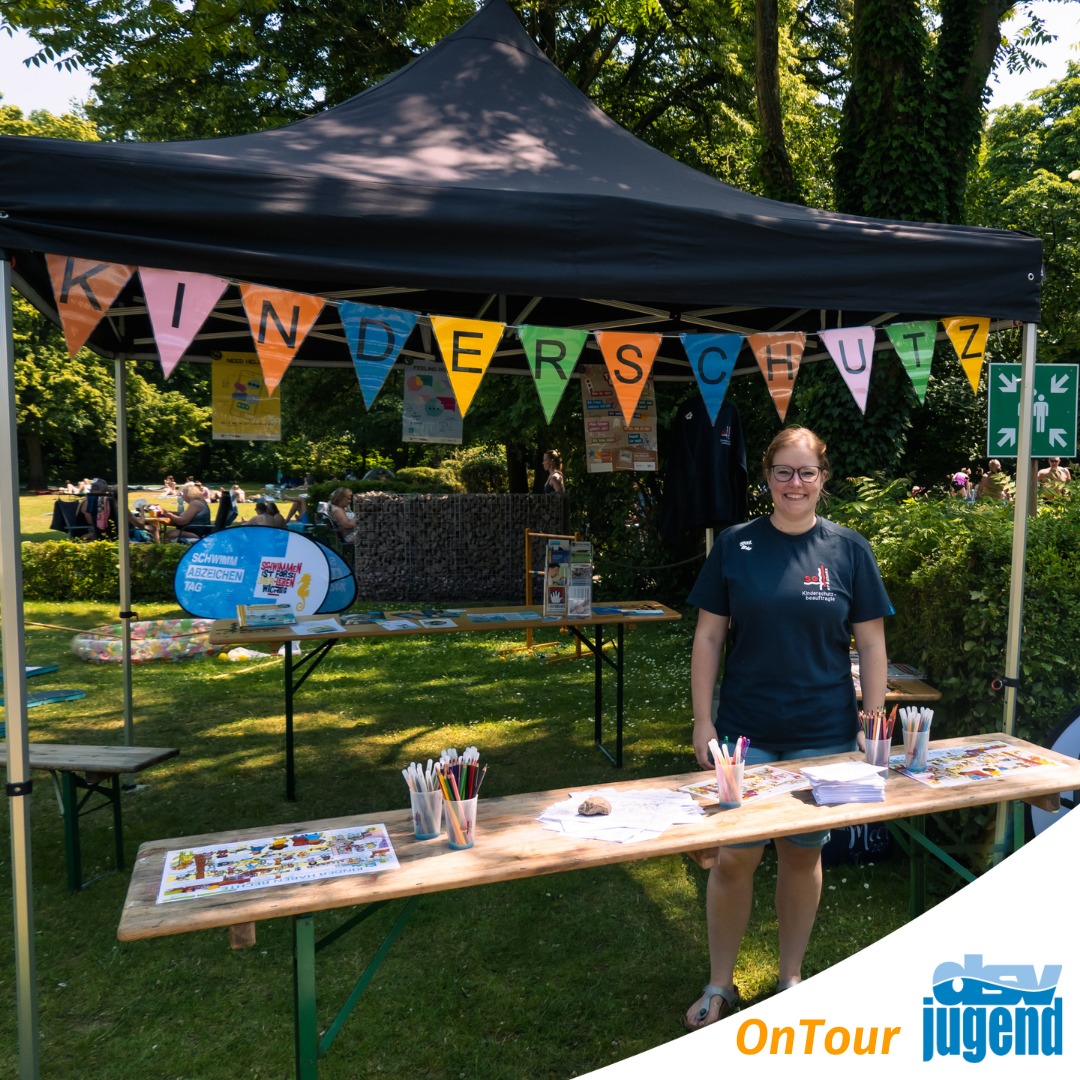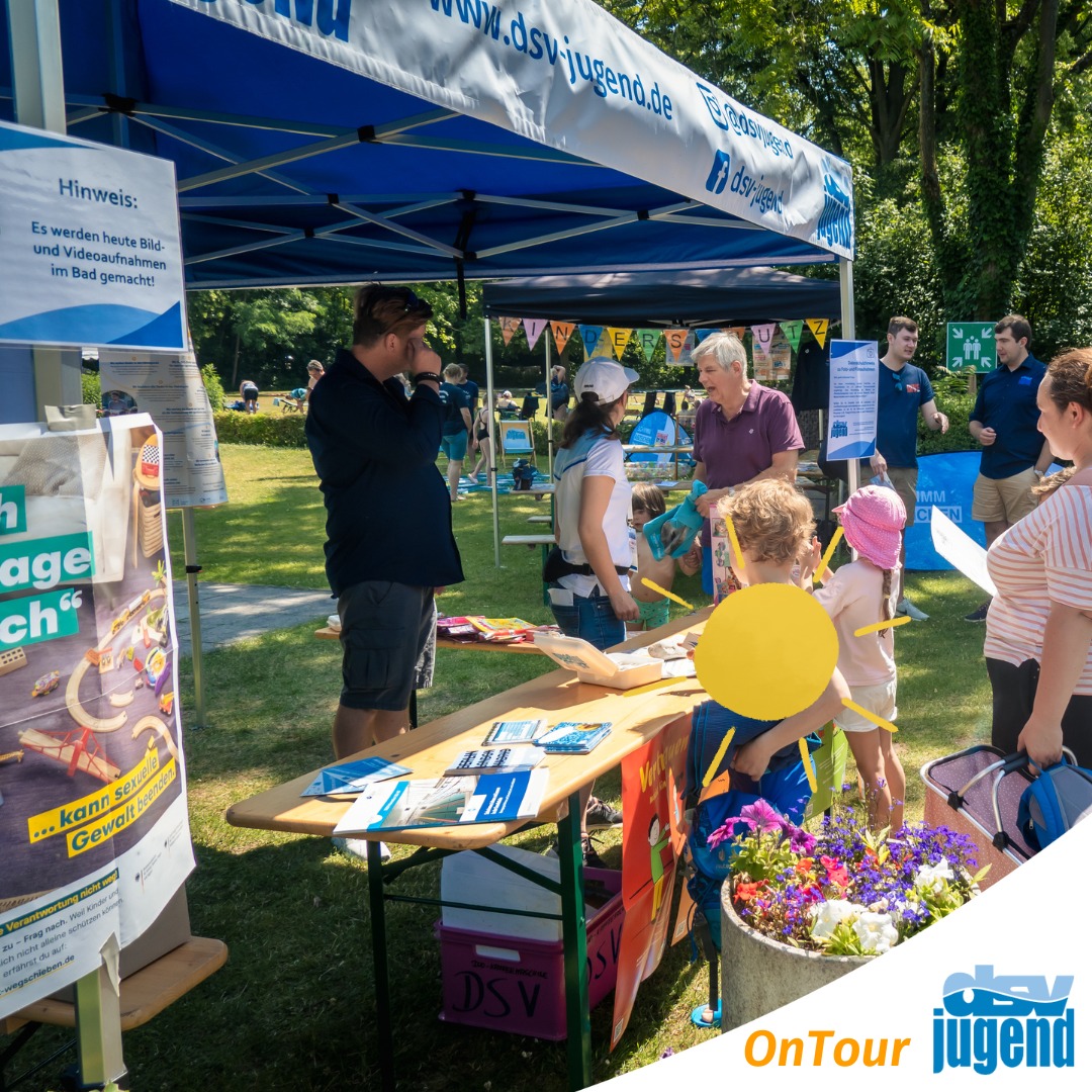 Dank des perfekt vorbereiteten Orga-Teams und den zahlreichen ehrenamtlichen Übungsleitungen der SG Neukölln wurden nach und nach mehr als 150 Abzeichenprüfungen abgenommen. Im Anschluss an die erfolgreichen Abnahmen konnten sich alle Kinder am Stand der dsv-jugend eine kleine Überraschung aussuchen, sich mit den beliebten Klebetattoos eindecken und nach Herzenslust spielen und bewegen, während die (Groß-)Eltern sich über verschiedene Themen wie Wassergewöhnung, Bädererhalt und Kinderschutz informieren konnten. In direkter Nachbarschaft hatte zudem die Kinderschutzbeauftragte der SG Neukölln ein Malangebot zum Thema Kinderrechte sowie zahlreiche Informationsmaterialien zur Prävention und Intervention bei Gewalt aufgebaut. Ein rundum gelungener Aktionstag für die Sicherheit am und im Wasser.