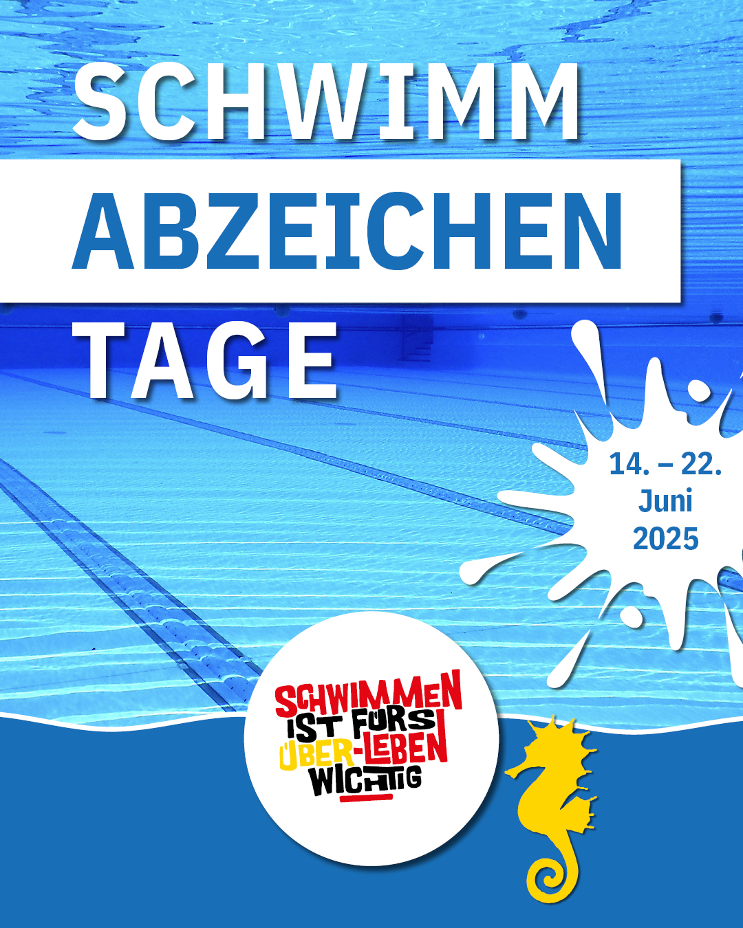 Das Event wird vom 14. – 22. Juni 2025 stattfinden und bietet in diesem Zeitraum Menschen aller Altersgruppen die Gelegenheit, ihre Schwimmfähigkeiten zu testen, ein Schwimmabzeichen zu erwerben und die Freude am Schwimmen zu entdecken.💦