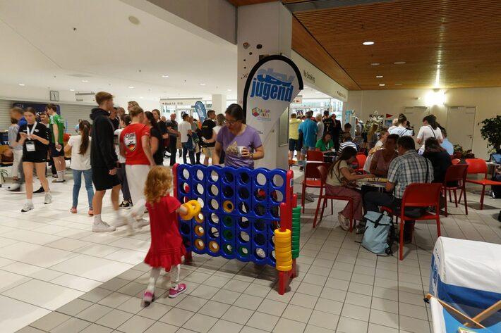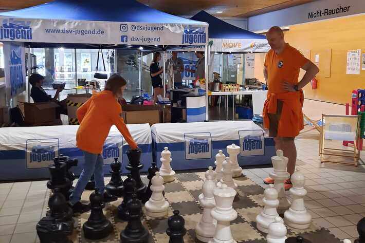 Neben der traditionellen Becher-ohne-Boden-Aktion hatten wir zahlreiche Groß- und Kleinspielgeräte mit dabei, um den Aktiven, Geschwisterkindern, Eltern und Zuschauenden die langen Wettkampftage zu verkürzen. Neben 4-Gewinnt und verschiedenen Zielwurfspielen wurde auch das Großfeldschachspiel der Deutschen Schachjugend rege genutzt. Vielen Dank an dieser Stelle für die Leihgabe.
