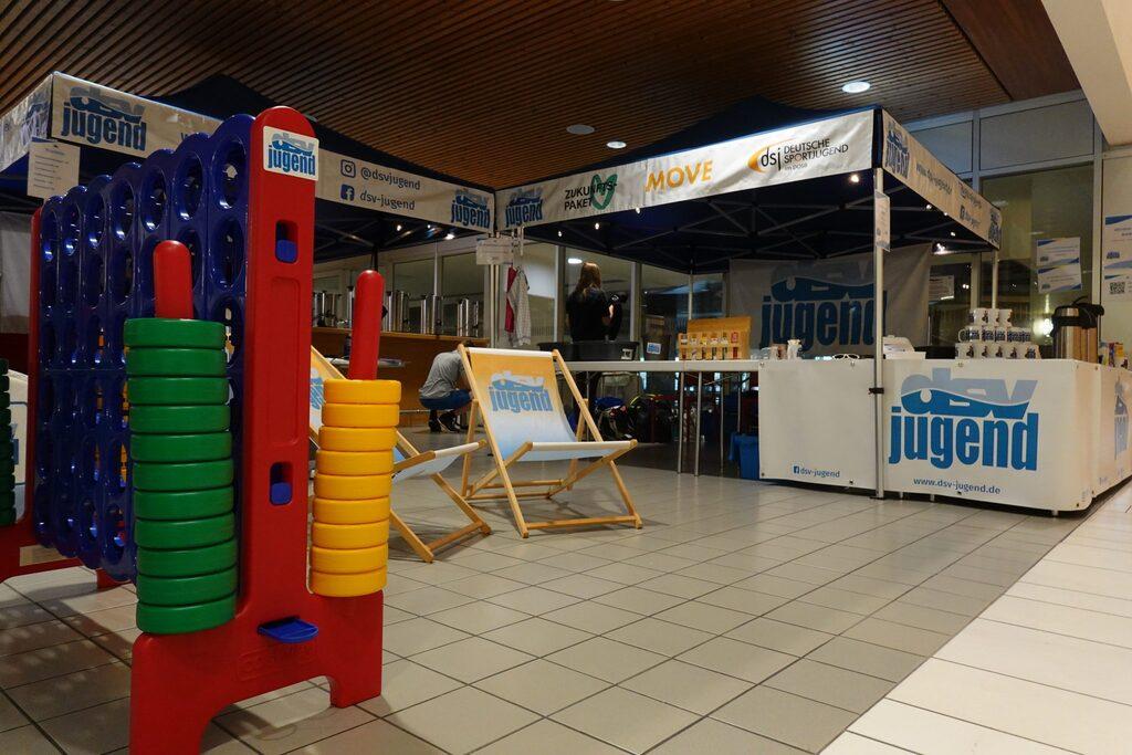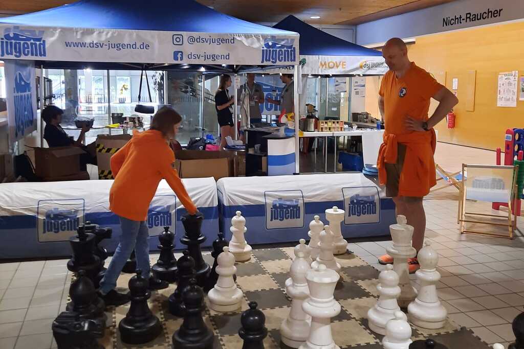 Neben der traditionellen Becher-ohne-Boden-Aktion hatten wir zahlreiche Groß- und Kleinspielgeräte mit dabei, um den Aktiven, Geschwisterkindern, Eltern und Zuschauenden die langen Wettkampftage zu verkürzen. Neben 4-Gewinnt und verschiedenen Zielwurfspielen wurde auch das Großfeldschachspiel der Deutschen Schachjugend rege genutzt. Vielen Dank an dieser Stelle für die Leihgabe.